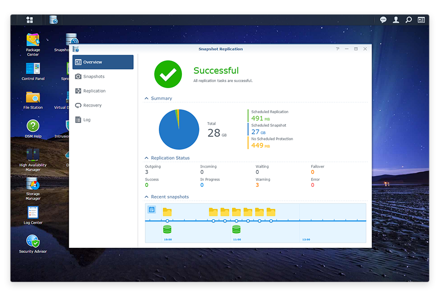 FS3017 內(nèi)建可拍攝高達(dá) 65,000 張備份快照并抄寫至異地服務(wù)器的 Snapshot Replication 套件,帶來(lái)高速的數(shù)據(jù)保護(hù),并確保共享文件夾中的數(shù)據(jù)或 iSCSI LUN 中的虛擬機(jī)即便遇上災(zāi)難事件也能十分安全。