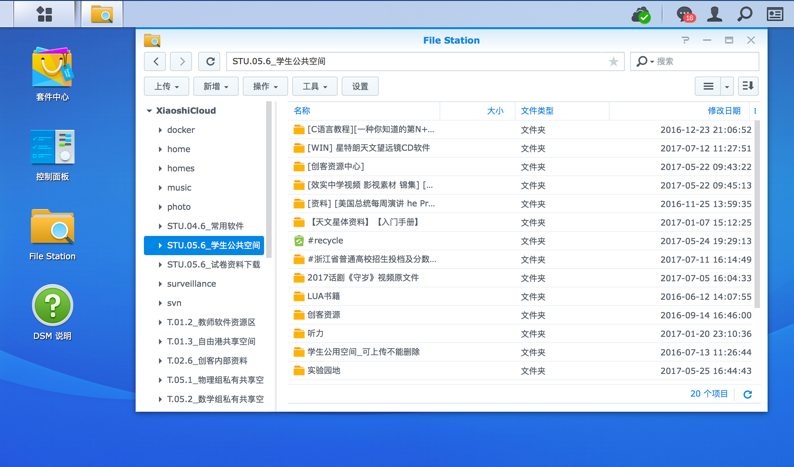 說到資料的整合,這里也不得不說一下資料的存儲(chǔ)與管理。學(xué)校因?yàn)轭悇e繁復(fù),文件較多且較分散,存放及調(diào)取都非常麻煩。使用 File Station 之后可以非常便利的進(jìn)行分類并存放文件,全校都可以用來(lái)存儲(chǔ)下載文件。通過不同的權(quán)限分配,以及不同功能的文件夾,將不同課目,不同班級(jí)等進(jìn)行整理分類后, 所有文件一目了然。