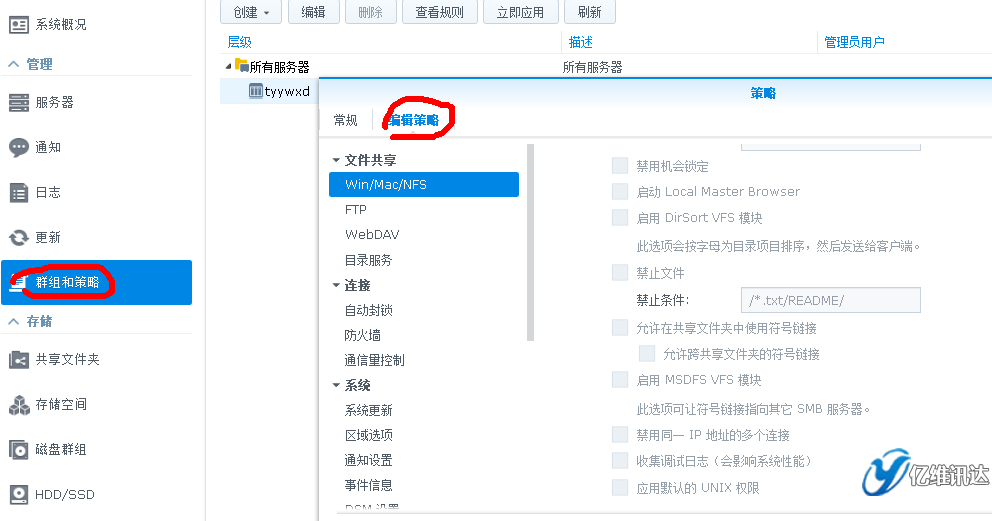 群暉Synology 山西總代:太原億維訊達科技 策略是一系列規(guī)則,其中每個規(guī)則都是指定的設(shè)置首選項,如啟用 Windows 文件服務或啟用 SSH 服務。當一項策略被應用到托管服務器或服務器組后,被該策略規(guī)則定義的首選項將應用到該服務器或服務器組。這可讓您將統(tǒng)一的設(shè)置應用多臺服務器而無需分別登錄每臺服務器。