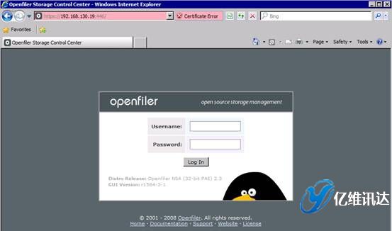 Openfiler 鏡像系統(tǒng)配置當(dāng) Openfiler 系統(tǒng)安裝并重啟完成后,對系統(tǒng)所有后續(xù)的配置過程,都是以 Web 方式配置完成的。這種全部基于 Web 的系統(tǒng)配置方式,使得配置過程變得更加簡易,同時(shí)也帶來了良好的用戶體驗(yàn)。首先打開瀏覽器,輸入地址:https://IP:446。注意,此處輸入的 IP 地址為在系統(tǒng)安裝時(shí)所配置的固定 IP 地址。然后使用系統(tǒng)初始默認(rèn)的用戶名和密碼進(jìn)行登陸。用戶名為 openfiler,密碼為 password。系統(tǒng)初始的用戶名和密碼可以在第一次登入系統(tǒng)后進(jìn)行重新設(shè)置。如圖所示。